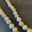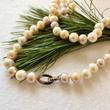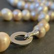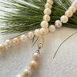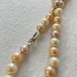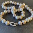 Bei dieser Kette sind es Süßwasserperlen, die unterschiedliche, warme Naturtöne haben. Die Form ist rundoval, was Sie auf den Fotos gut erkennen können.